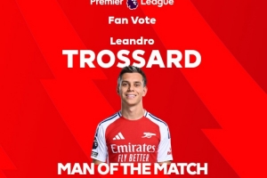 首开记录,英超官方:特罗萨德当选阿森纳1-1埃弗顿球迷票选最佳